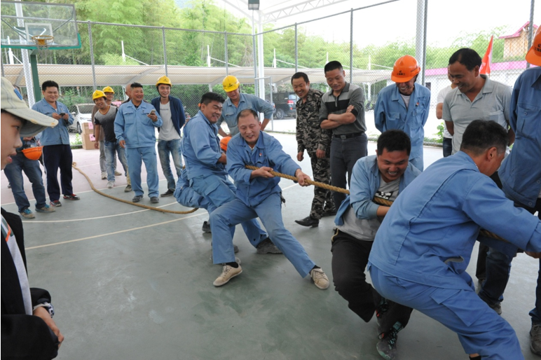 下午的拔河比賽以各部門為單位,共分采礦、頭破、一線、二線、固液、碼頭、科室、外協(xié)8個運(yùn)動隊。通過抽簽分成每兩組進(jìn)行淘汰賽,每組勝利隊進(jìn)決賽分出最終冠軍、亞軍、季軍。賽場上,兩組隊員們口中一起高呼著“一二,一二”, 雙手緊握長繩,未參賽的員工自發(fā)組成啦啦隊為比賽隊員吶喊加油,吶喊聲此起彼伏,飄蕩在上空。拔河比賽由外協(xié)部門取得最終的勝利!
