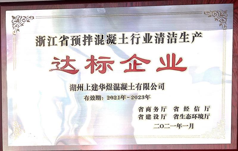 湖州上建華煜獲“浙江省預(yù)拌混凝土行業(yè) 清潔生產(chǎn)達(dá)標(biāo)企業(yè)”榮譽(yù)稱號(hào)