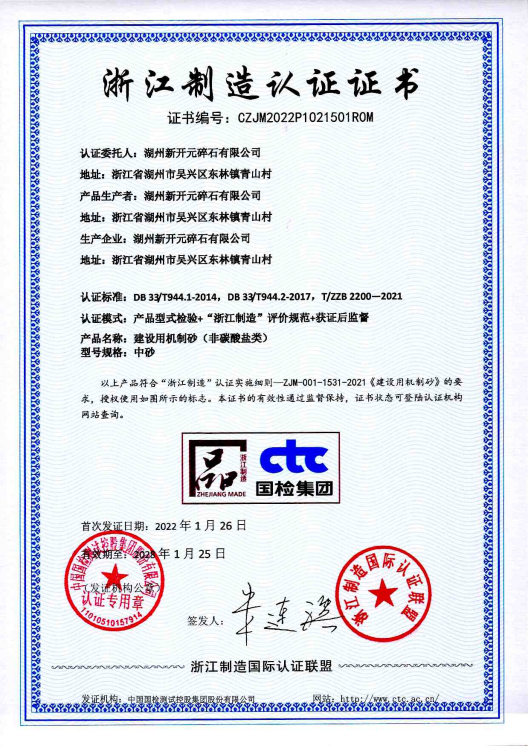 經(jīng)過(guò)產(chǎn)品檢驗(yàn)、第三方現(xiàn)場(chǎng)評(píng)審等環(huán)節(jié),湖州新開(kāi)元碎石有限公司建設(shè)用機(jī)制砂日前順利通過(guò)“浙江制造”認(rèn)證,獲得《浙江制造認(rèn)證證書》。