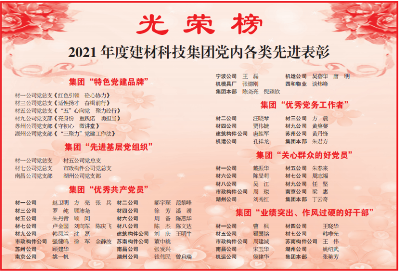 7月4日,上海建工建材科技集團(tuán)召開黨內(nèi)先進(jìn)表彰會(huì)暨黨建品牌發(fā)布會(huì)。湖州公司榮獲2021年度上海建工建材科技集團(tuán)“先進(jìn)基層黨組織”,姚紹武同志榮獲上海建工建材科技集團(tuán)“業(yè)績突出、作風(fēng)過硬的好干部”,錢偉民同志、曾啟瑞同志榮獲上海建工建材科技集團(tuán)“優(yōu)秀共產(chǎn)黨員”,劉秀紅同志榮獲上海建工建材科技集團(tuán)“關(guān)心群眾的好黨員”。
